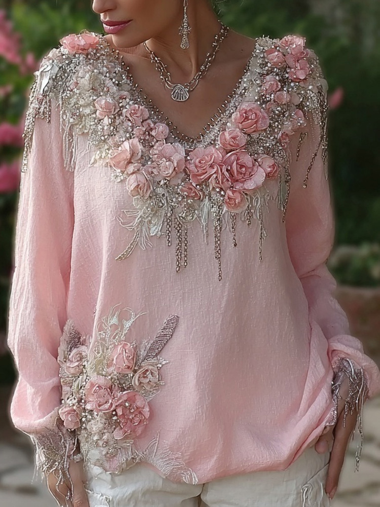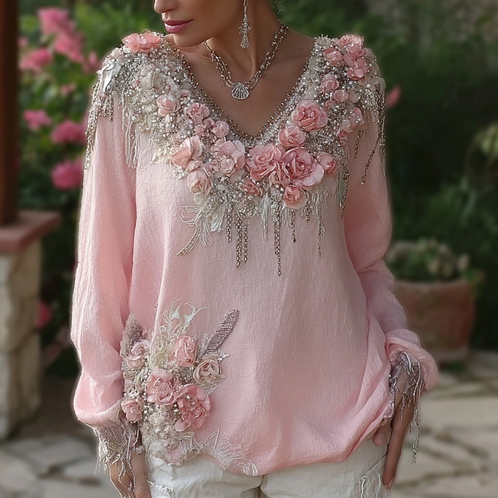 Vintage Boho Roses Art Glitter Cozy Linen Tunic
