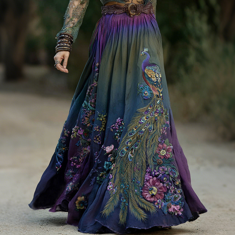 Vintage Classy Gradient Peacock And Floral Embroidered Art Linen Blend Casual Skirt