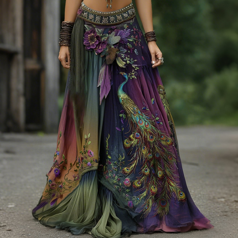 Vintage Classy Gradient Peacock With Floral Embroidered Art Linen Blend Casual Skirt
