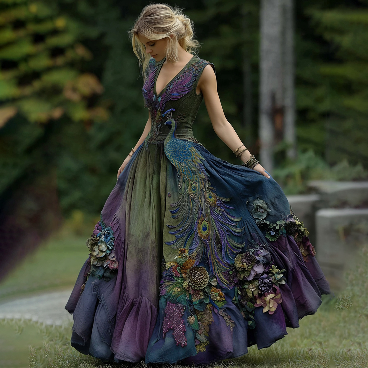Vintage Classy Gradient Purple Peacock And Floral Embroidered Sleeveless V Neck Maxi Dress