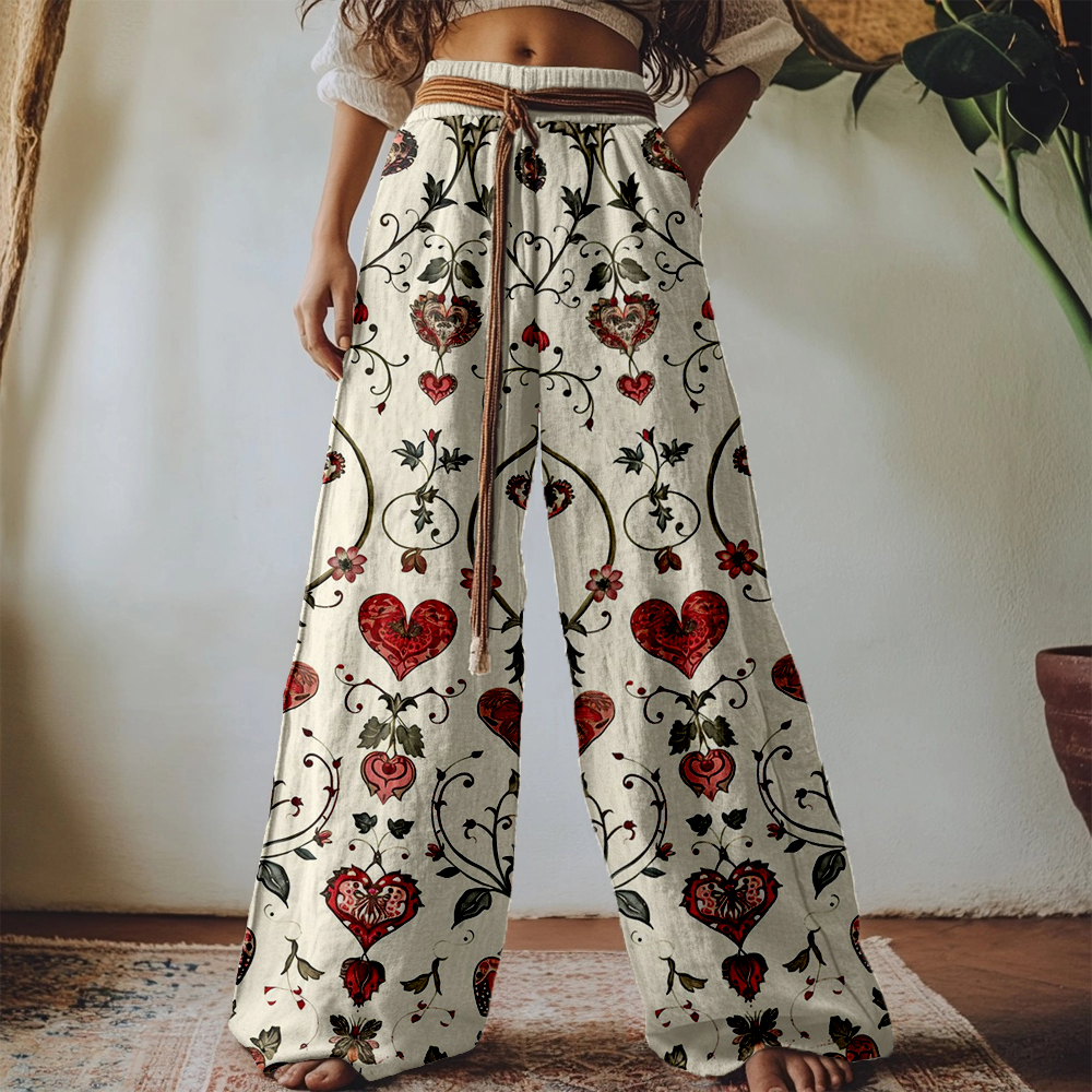 Vintage Floral Heart Pattern Linen Blend Casual Pants