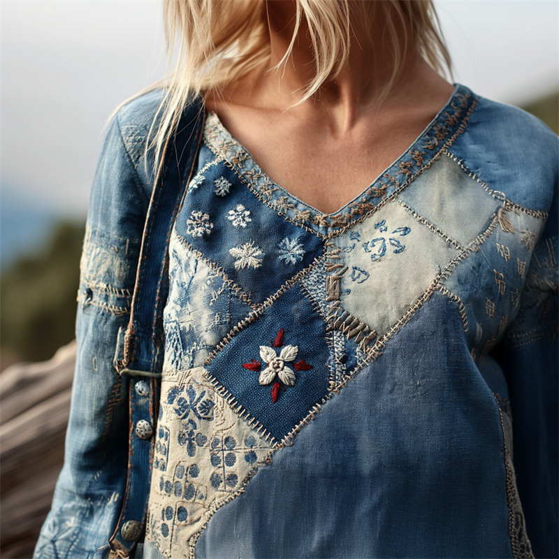 Vintage Floral Japanese Sashiko Embroidered Patchwork Linen Tunic