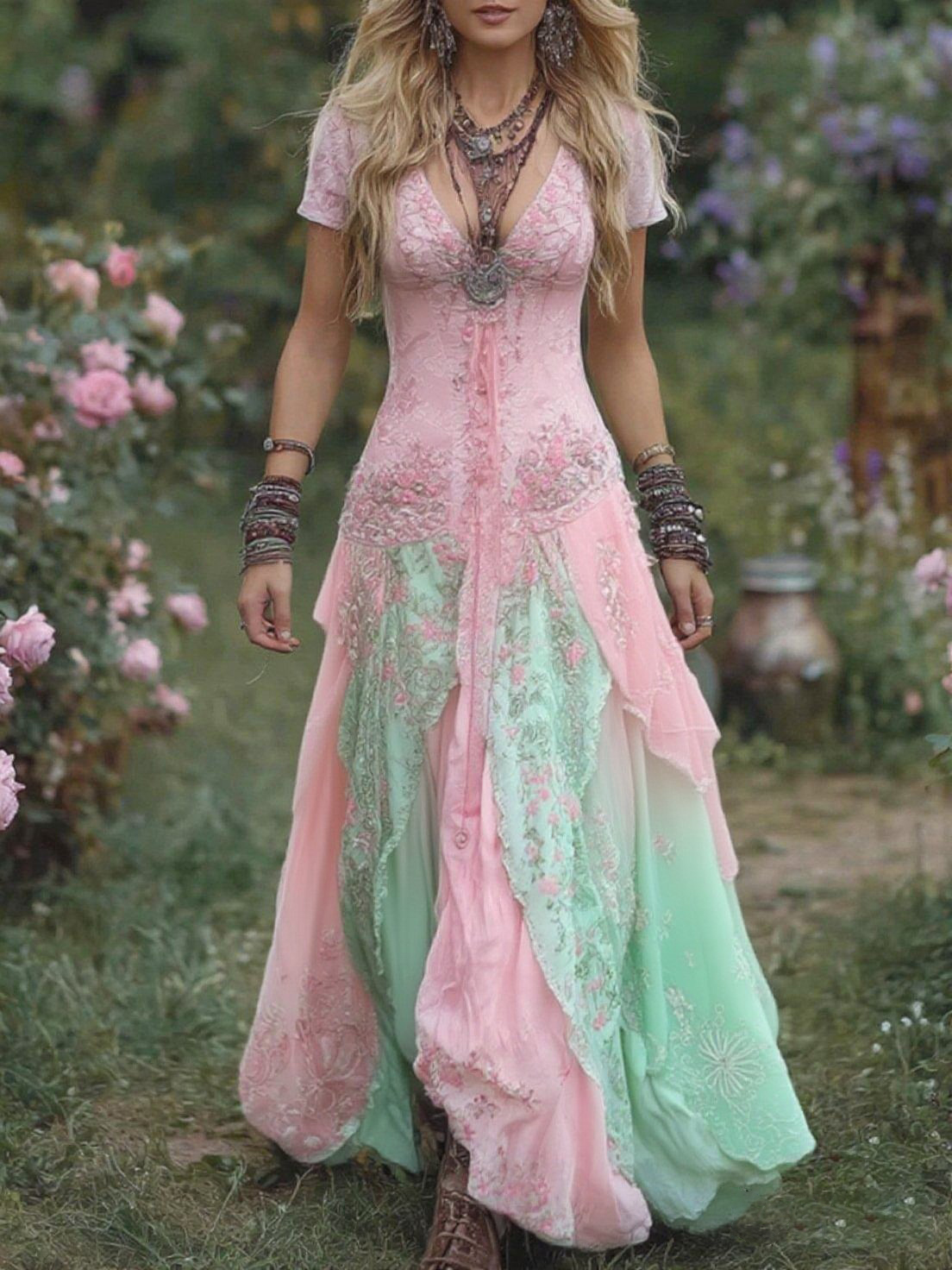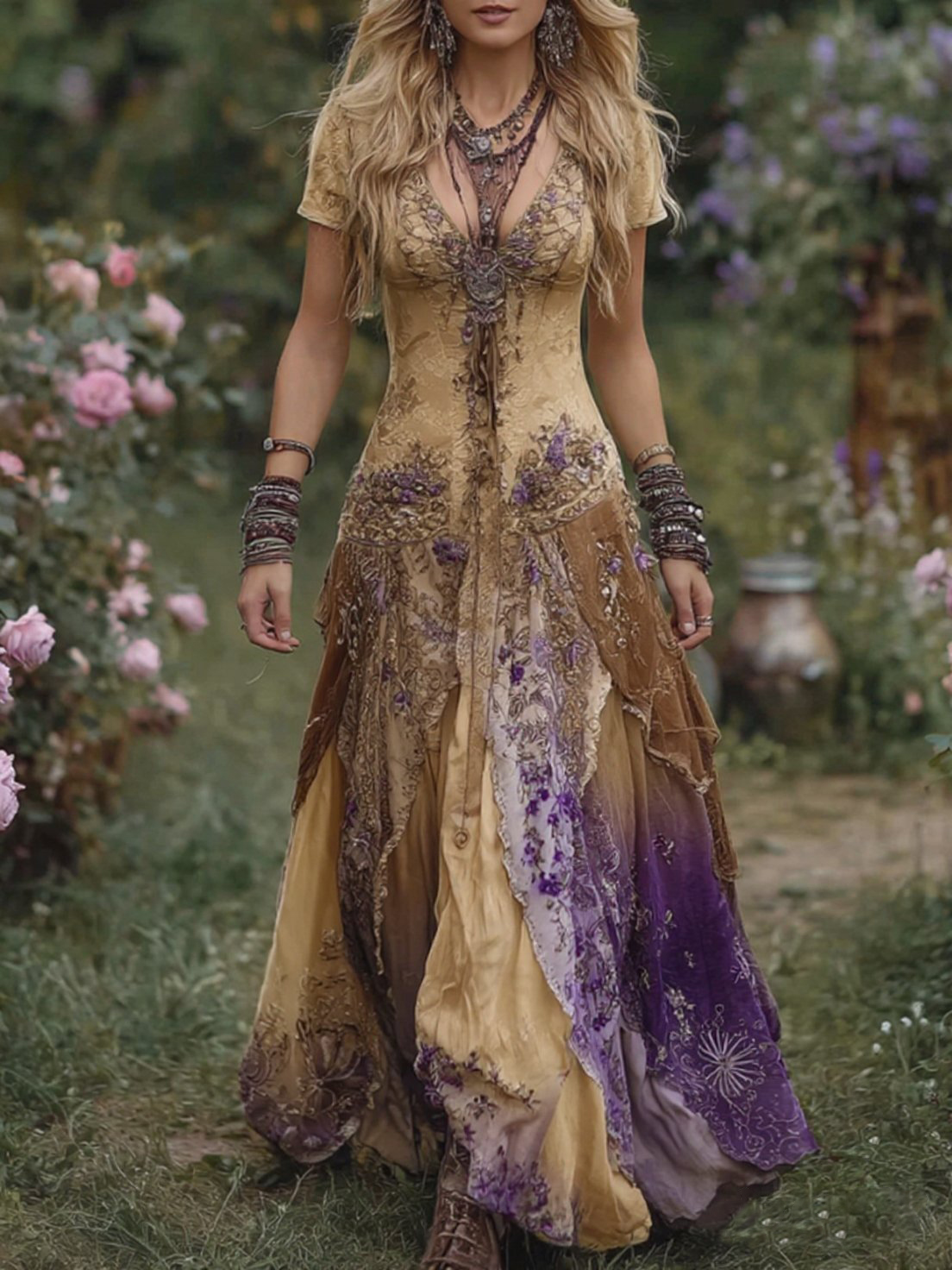 Vintage Gradient Purple Floral Embroidered Linen Maxi Dress