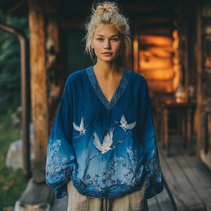 Vintage Japanese Sashiko Floral Crane Gradient Art Print Linen Tops