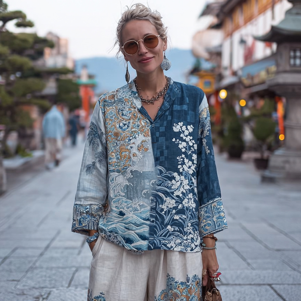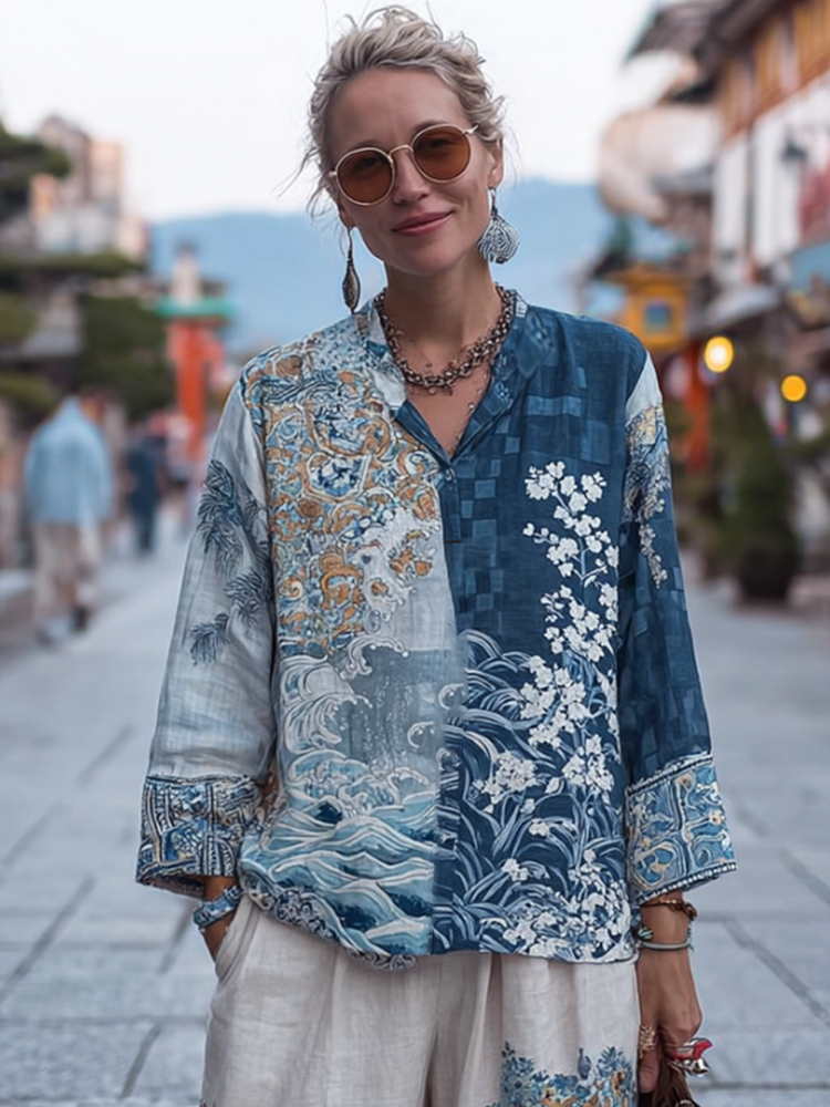 Vintage Japanese Traditional Embroidery Floral Patchwork Art Printed Linen Top