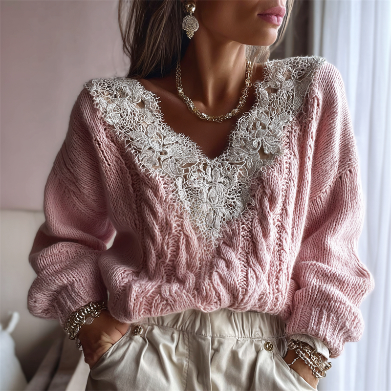Vintage Lace Patchwork V Neck Cozy Cable Knit Sweater