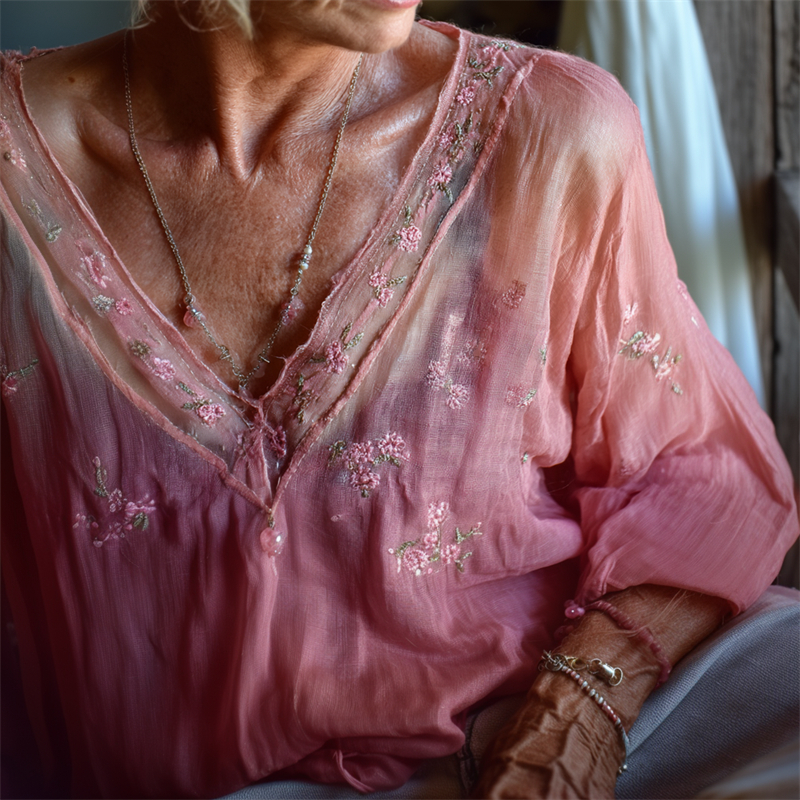 Vintage Pink Floral Embroidered Flowy Gradient Linen Tunic
