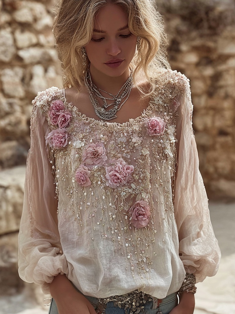 Vintage Pink Flowers Embroidered Long Sleeve Linen Tunic