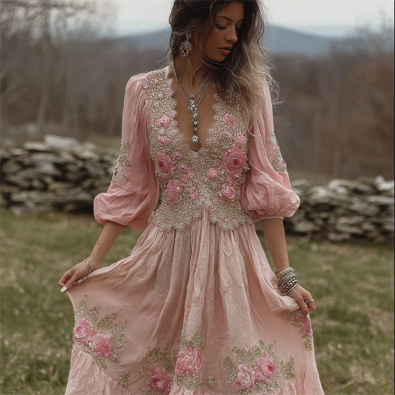 Vintage Pink Roses Embroidered Lace Linen Maxi Dress