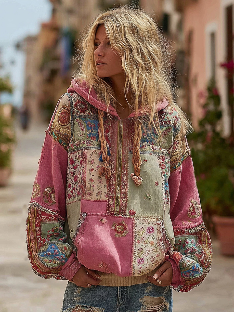 Women's Bohemian Floral And Ethnic Pattern Patchwork Cozy Warm Hoodie