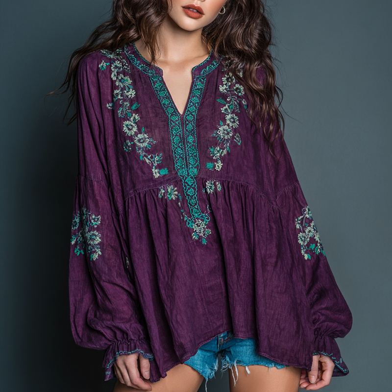 Women's Casual Floral Embroidered Art Print Flowy Linen Blend Tunic