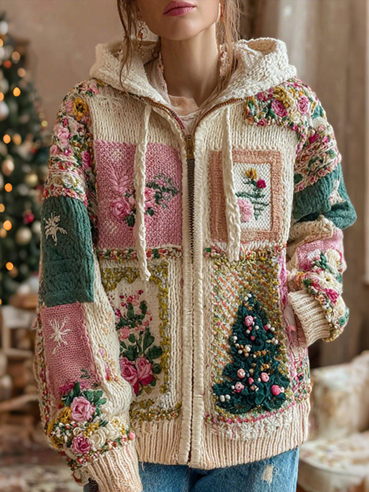 Women's Christmas Tree And Rose Pattern Knitted Zip-up Hooded Sweater