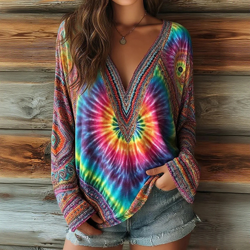 Women's Ethnic Geometric Tie-dye Print V-neck T-shirt
