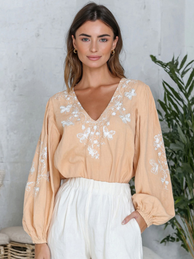 Women's Floral And Butterfly Pattern Linen V-neck T-shirt