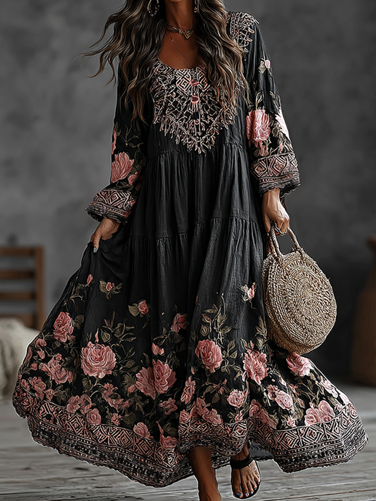 Women's Floral Art Flowy Linen Blend Casual Long Sleeve Maxi Dress