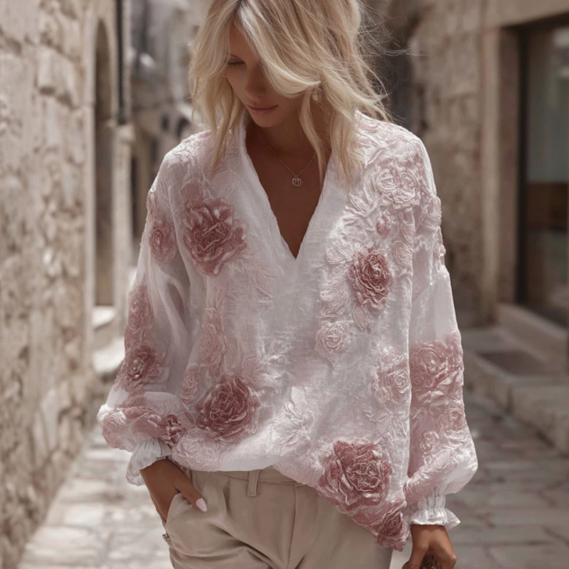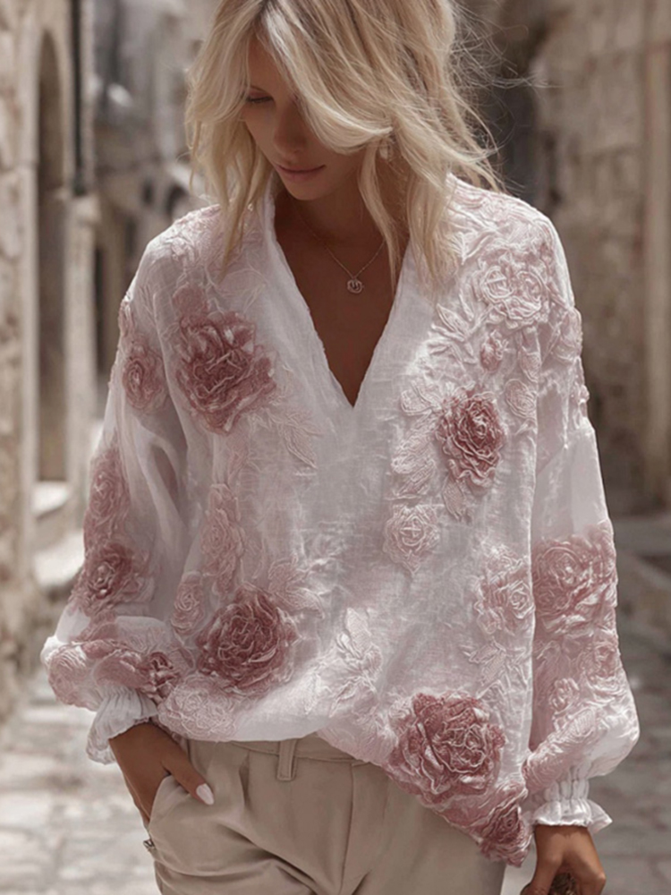 Women's Floral Embroidery Linen V-neck T-shirt