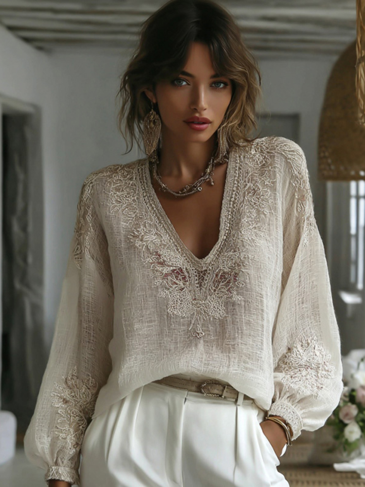 Women's Floral Embroidery Linen V-neck T-shirt