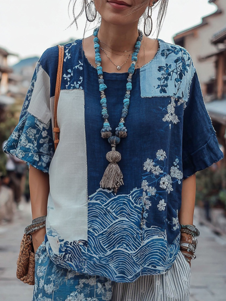 Women's Japanese Traditional Sashiko And Wave Patchwork Art Linen Short-sleeved Top