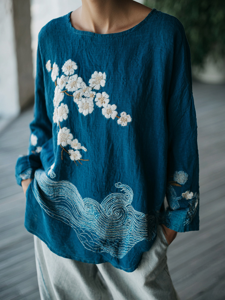 SPU: DZ-271978-QXFabric Name: 95% Cotton-5% NylonPattern: Waves And Cherry BlossomsProcess: EmbroideredStyle: VintageLength: Mid-LengthCollar: Round NeckPopular Elements: Waves And Cherry BlossomsSleeve Type: Long SleeveOccasion: DailyTheme: Spring, FallNOTE: If you are not sure, please choose a larger size. If you have any doubts about this product, we suggest you contact our customer service team. Due to the color difference between the screens of different electronic devices (computers, mobile phones or ipads), especially the CRT screen and the LCD screen, the color of the item may be slightly different from what you see in the photos, please take the actual product as the standard.SizeBustLengthSleevecminchcminchcminchS11042.98432.86023.4M11444.58633.56123.8L11846.08834.36224.2XL12247.69035.16324.62XL12649.19235.96425.03XL13050.79436.76525.44XL13452.39637.46625.75XL13853.89838.26726.1Due to manual measurement, there may be an error of 1-3cm 28.99