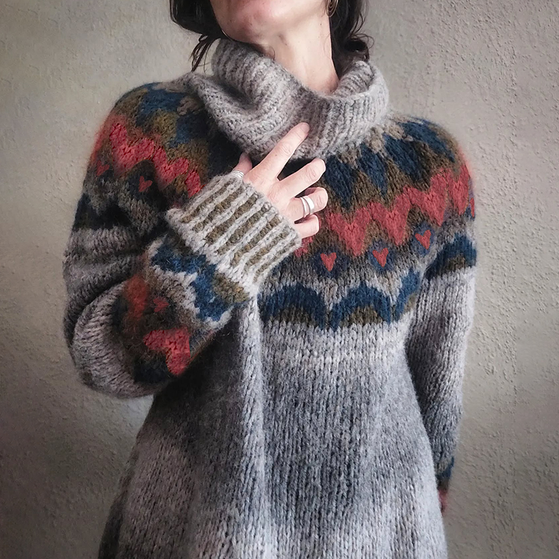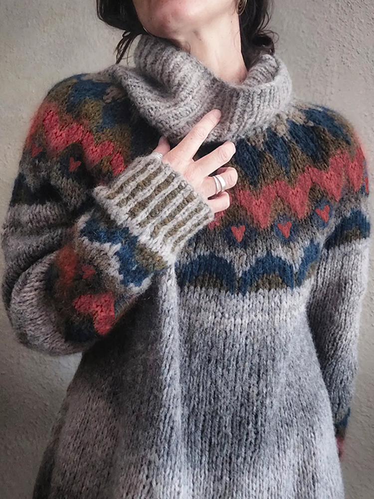 Women'S Love Heart Graphic Jacquard Fairman Island Turtleneck Sweater