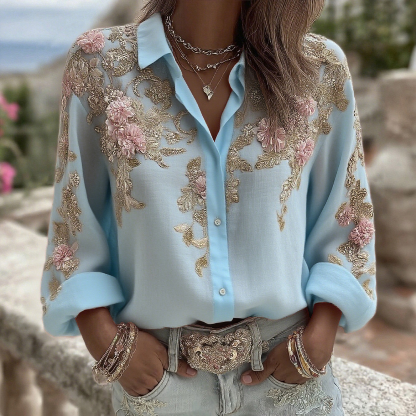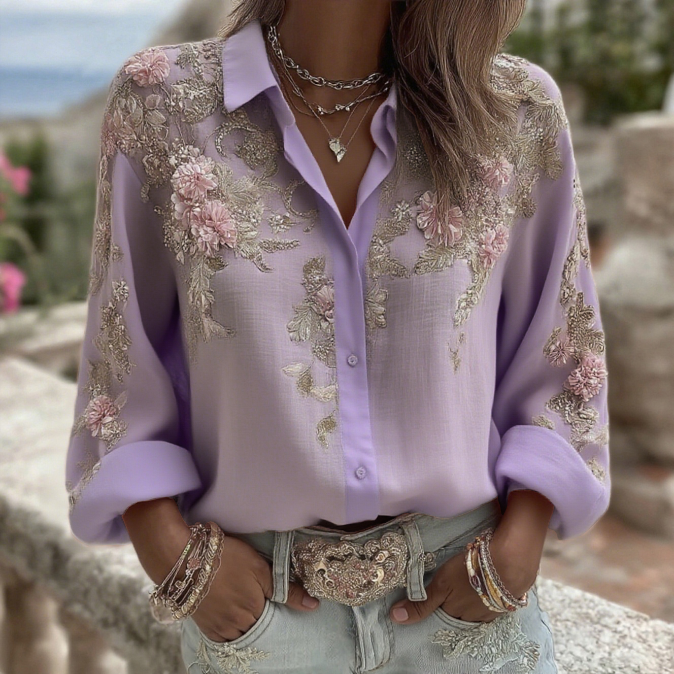 Women's Pink Flower Embroidery Art Long Sleeve Linen Blend Shirt