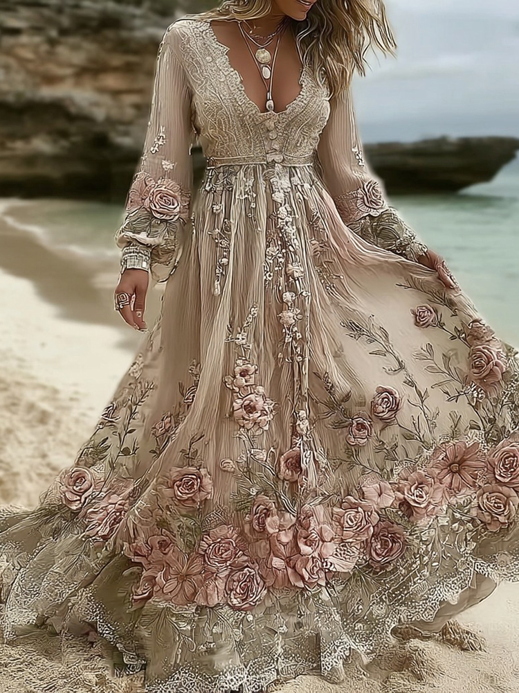 Women's Pink Rose Embroidered Casual And Elegant V-neck Dress