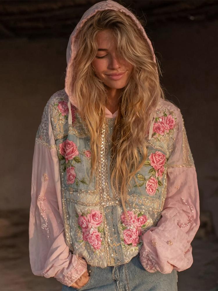 Women's Pink Rose Embroidered Denim Patchwork Hooded Sweatshirt