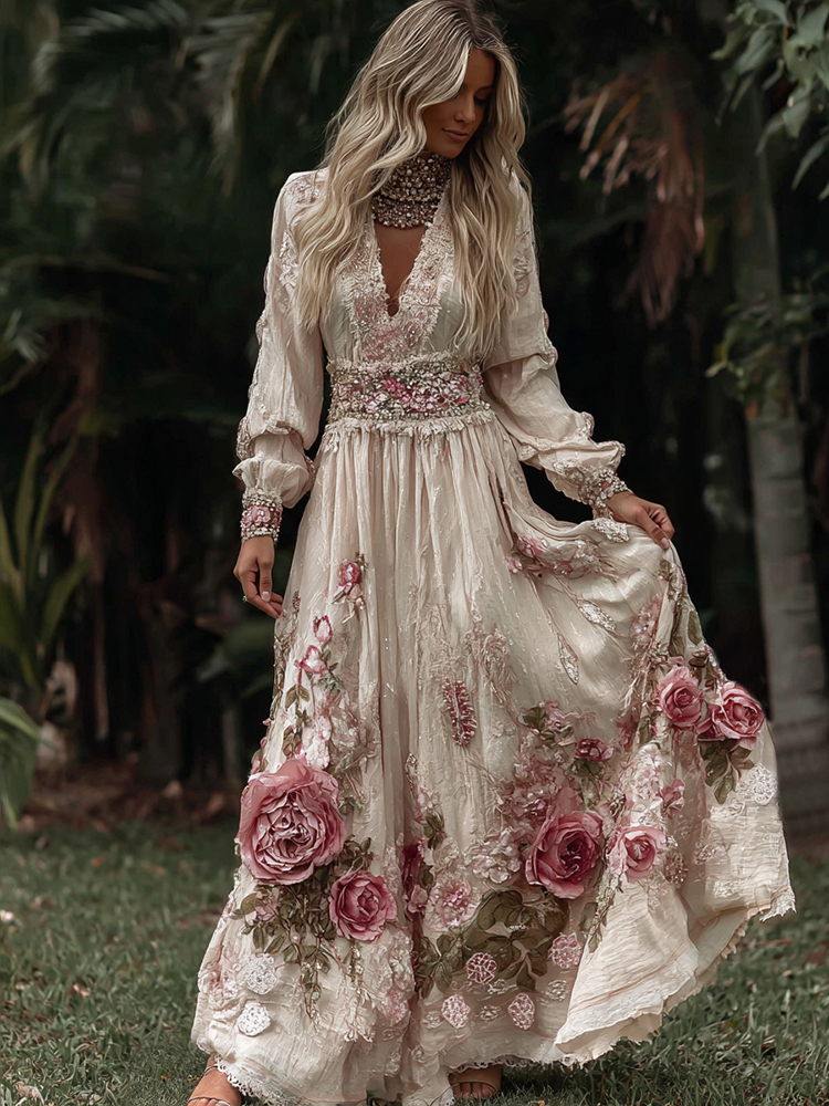 Women's Pink Roses Embroidery Art V-neck Long Sleeves Maxi Dress