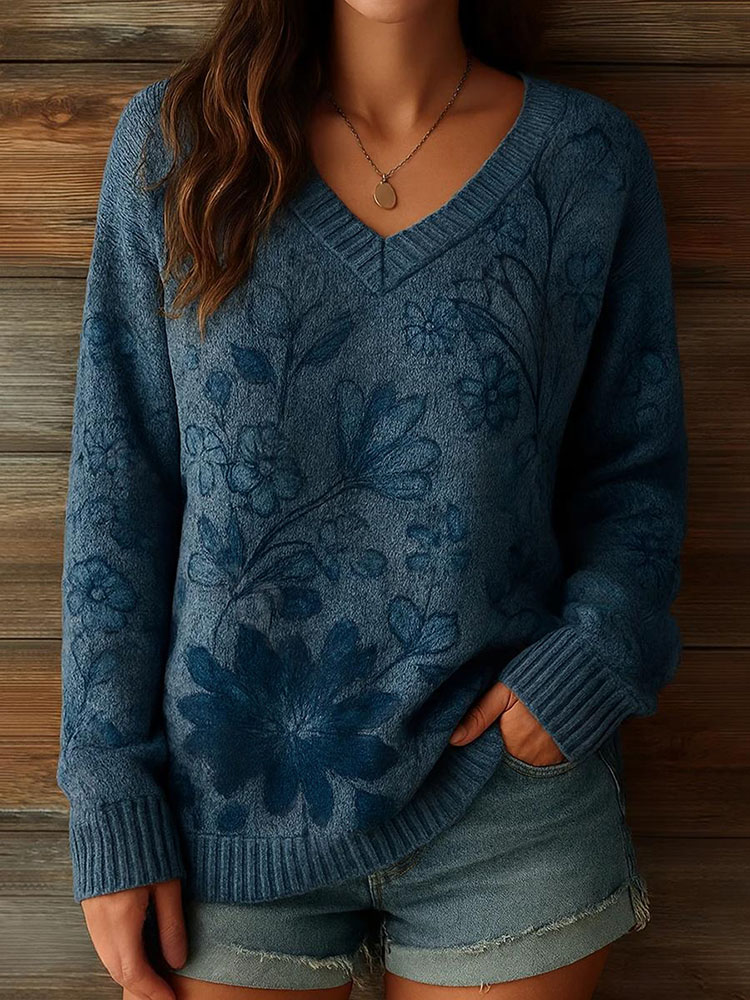 Women's Retro Floral Print V-neck Cozy Knit Sweater