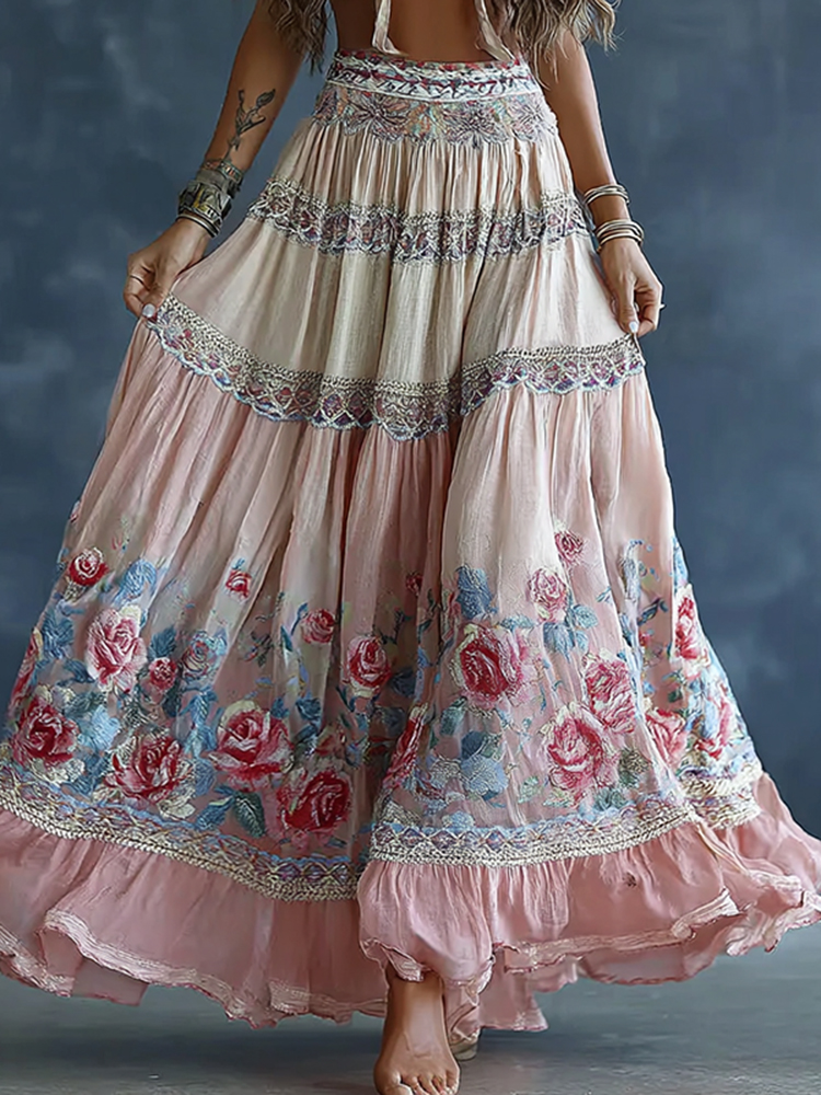 Women's Spring Floral Embroidered Art Print Flowy Linen Blend Casual Skirt