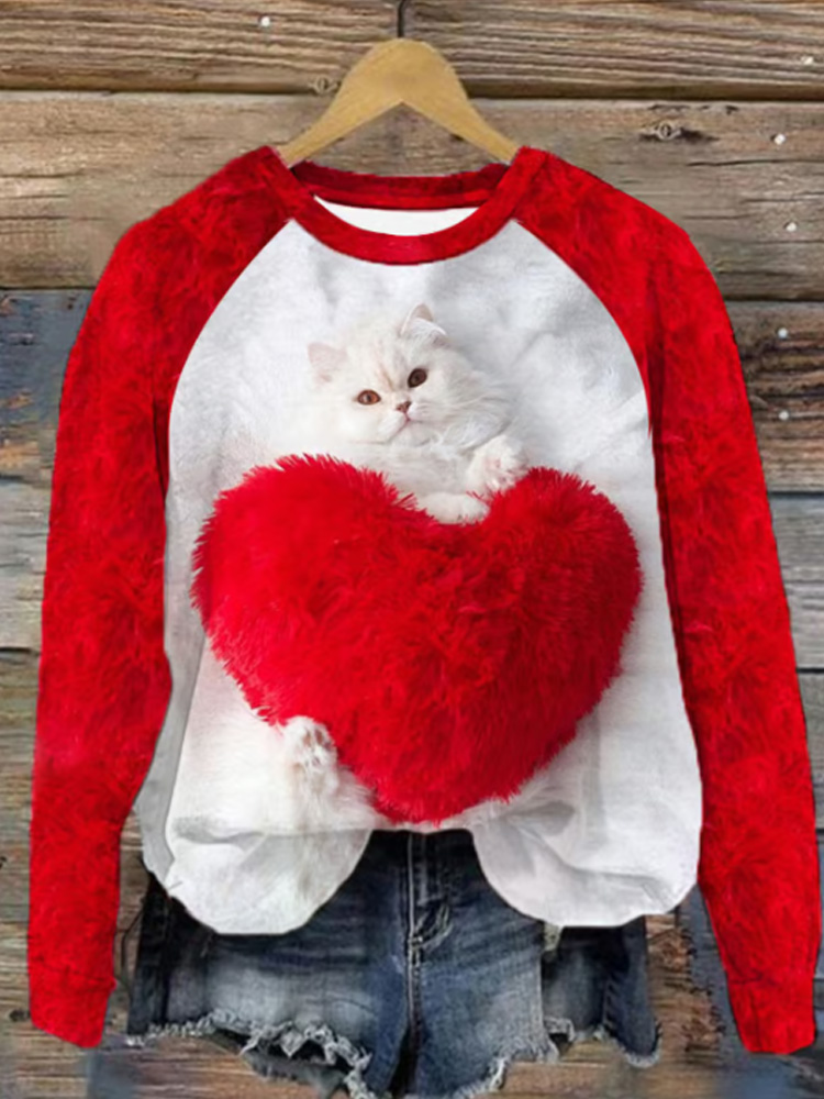 Women's Valentines Day Cute Cat Print Casual Sweatshirt
