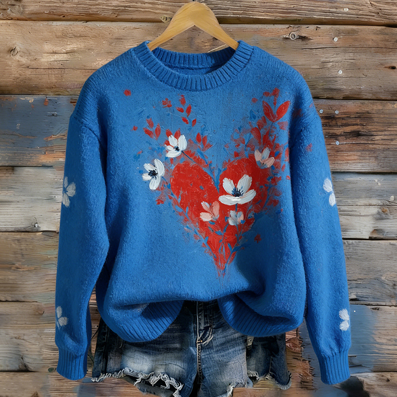 Women's Valentine's Day Heart And Floral Pattern Comfortable Crew Neck Sweater