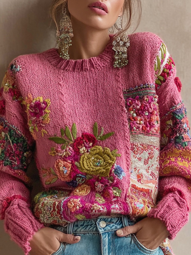 Women's Vintage Bohemian Floral Embroidery Art Cozy Knitted Sweater