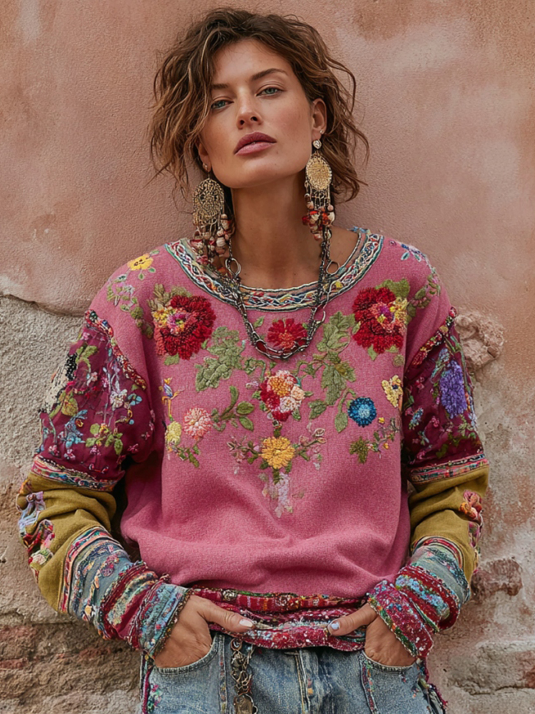 Women's Vintage Bohemian Floral Embroidery Patchwork Art Crew Neck Sweatshirt