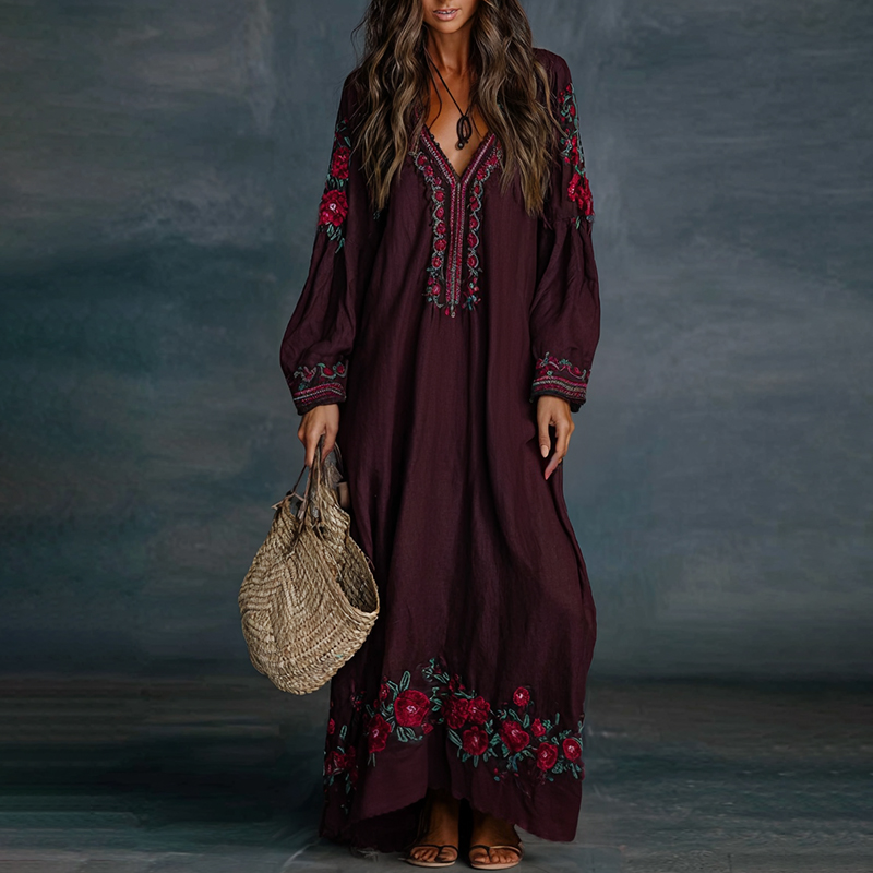 Women's Vintage Floral Art Print Flowy Linen Blend Casual Long Sleeve Maxi Dress