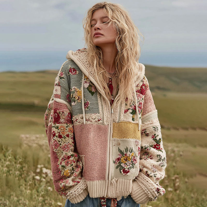 Women's Vintage Floral Patchwork Cozy Zipper Knit Sweater Hooded