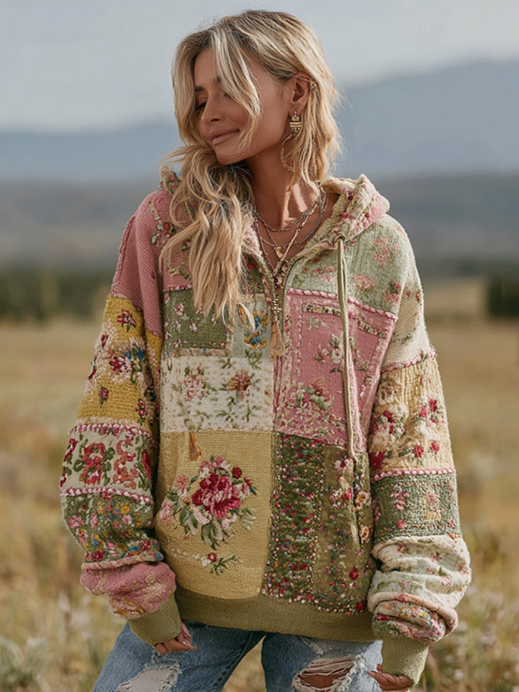 Women's Vintage Floral Patchwork Zipper Casual Hooded