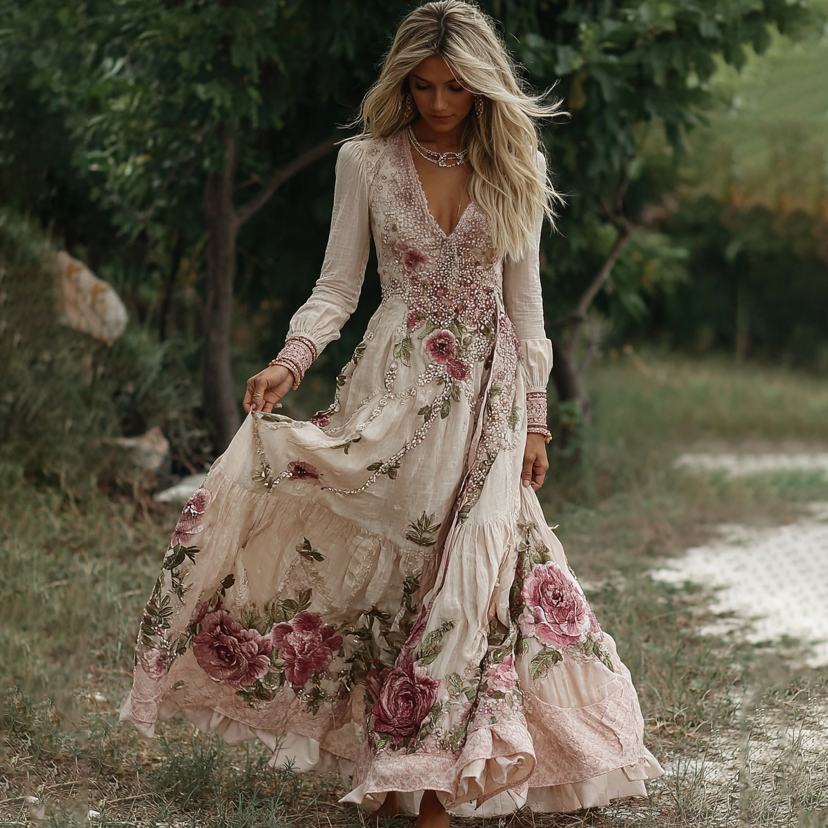 Women's Vintage Flowers Embroidery Art V-neck Long Sleeves Maxi Dress