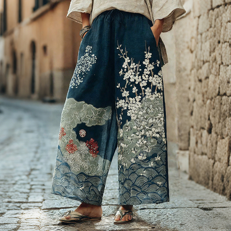 Women's Vintage Japanese Cherry Blossom And Wave Art Print Pants