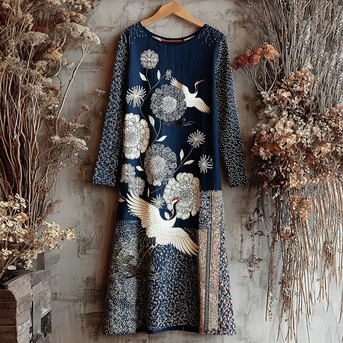 SPU: DZ-271779-YJFabric Name: 95% Cotton-5% NylonPattern: Japanese Crane ArtProcess: PaneledStyle: VintageLength: Ankle-LengthCollar: Round NeckPopular Elements: Japanese Crane ArtSleeve Type: Long SleeveOccasion: DailyTheme: Spring, FallNOTE: If you are not sure, please choose a larger size. If you have any doubts about this product, we suggest you contact our customer service team. Due to the color difference between the screens of different electronic devices (computers, mobile phones or ipads), especially the CRT screen and the LCD screen, the color of the item may be slightly different from what you see in the photos, please take the actual product as the standard.SizeBustLengthSleevecminchcminchcminchS9035.112548.85019.5M9537.112649.15119.9L10039.012749.55220.3XL10541.012849.95320.72XL11042.912950.35421.13XL11544.913050.75521.54XL12046.813151.15621.85XL12548.813251.55722.2Due to manual measurement, there may be an error of 1-3cm 37.99