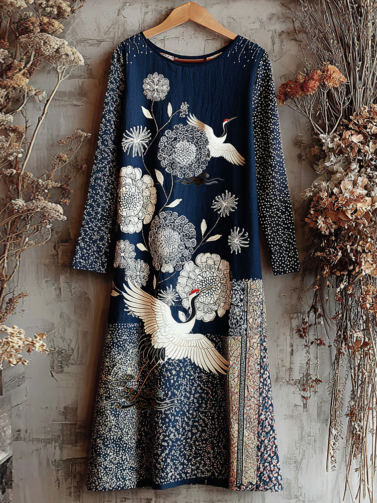Women's Vintage Japanese Crane Art Linen Blend Round Neck Dress