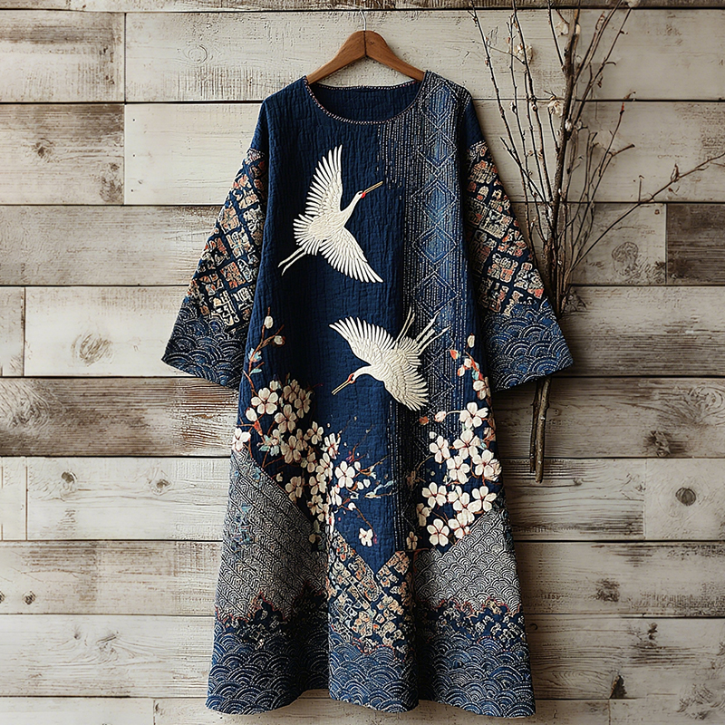 Women's Vintage Japanese Crane Art Linen Blend Round Neck Dress
