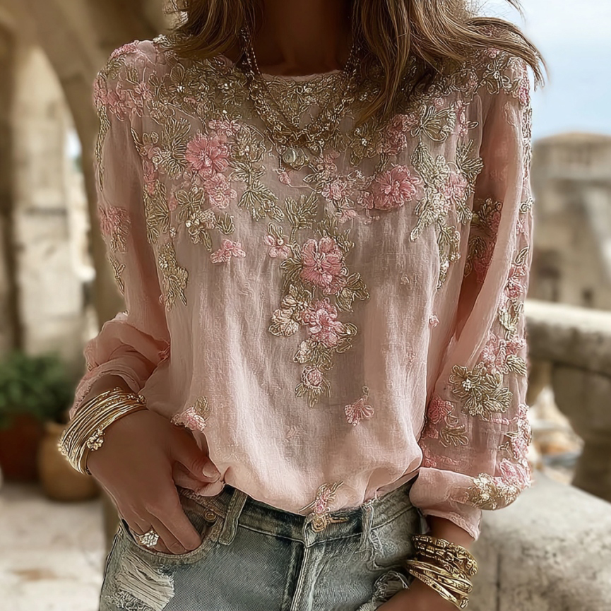 Women's Vintage Pink Flower Embroidery Art Print Round Neck Long Sleeve T-shirt