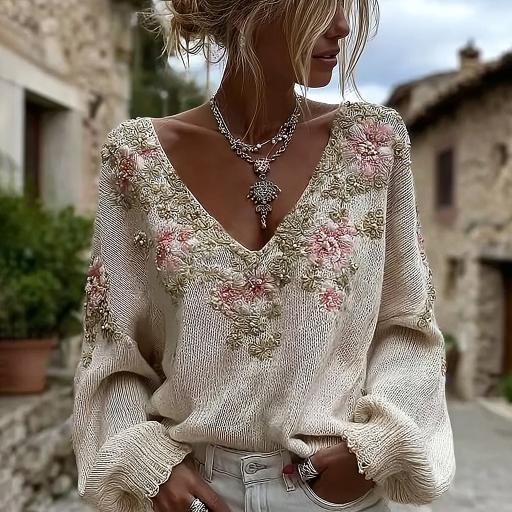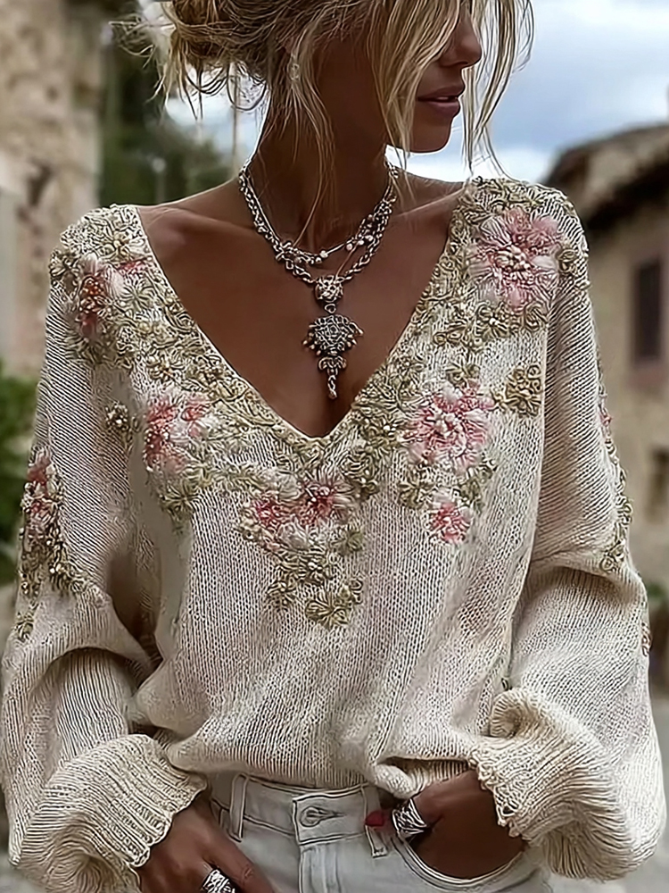 Women's Vintage Pink Flowers Art V-neck Cozy Knit Sweater