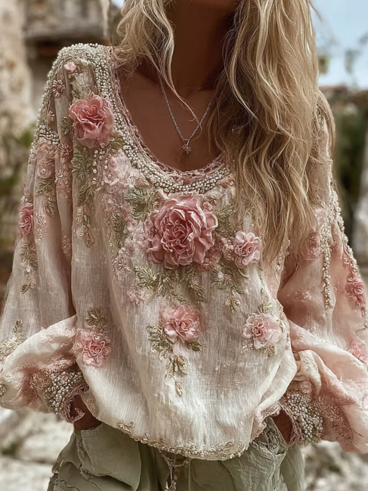 Women's Vintage Pink Roses Embroidery Art Print Round Neck Long Sleeve T-shirt