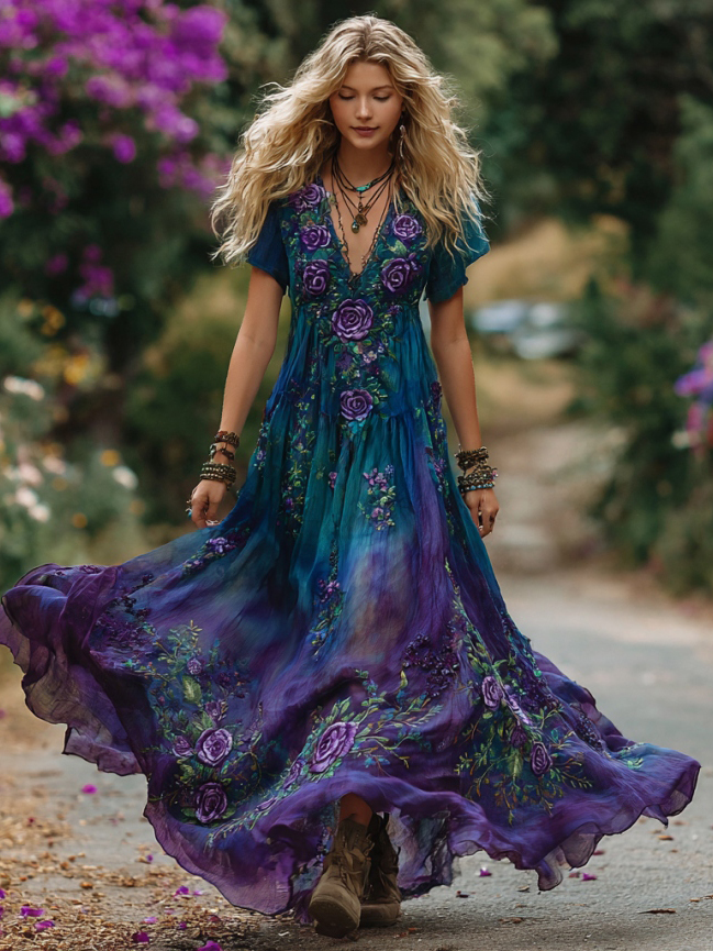 Women's Vintage Purple Roses Floral Embroidery Linen Short Sleeve Dress