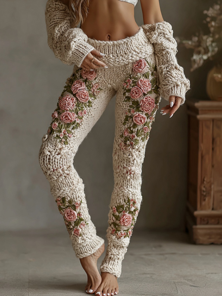 Women's Vintage Rose Floral Art Cozy Knit Leggings