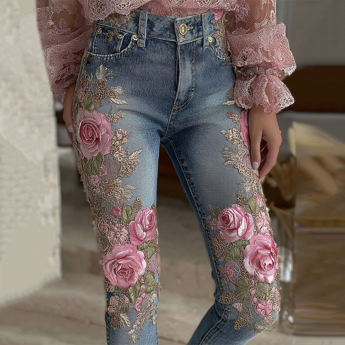 Women's Vintage Rose Floral Embroidery Gradient Art Casual Jeans