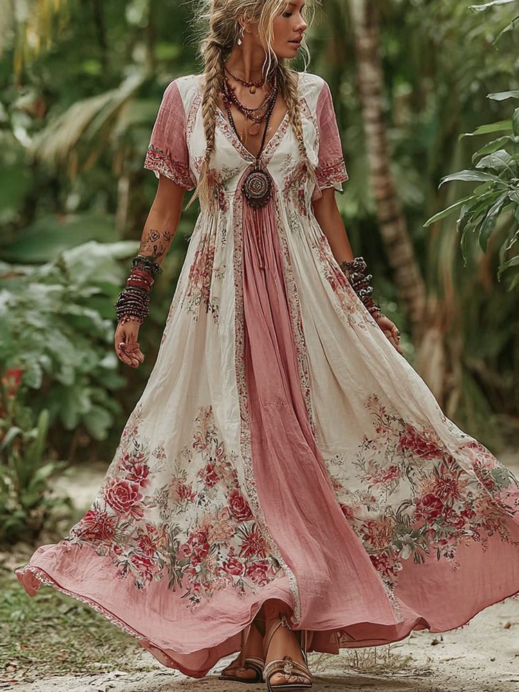 Women's Vintage Rose Floral Pattern V-neck Dress