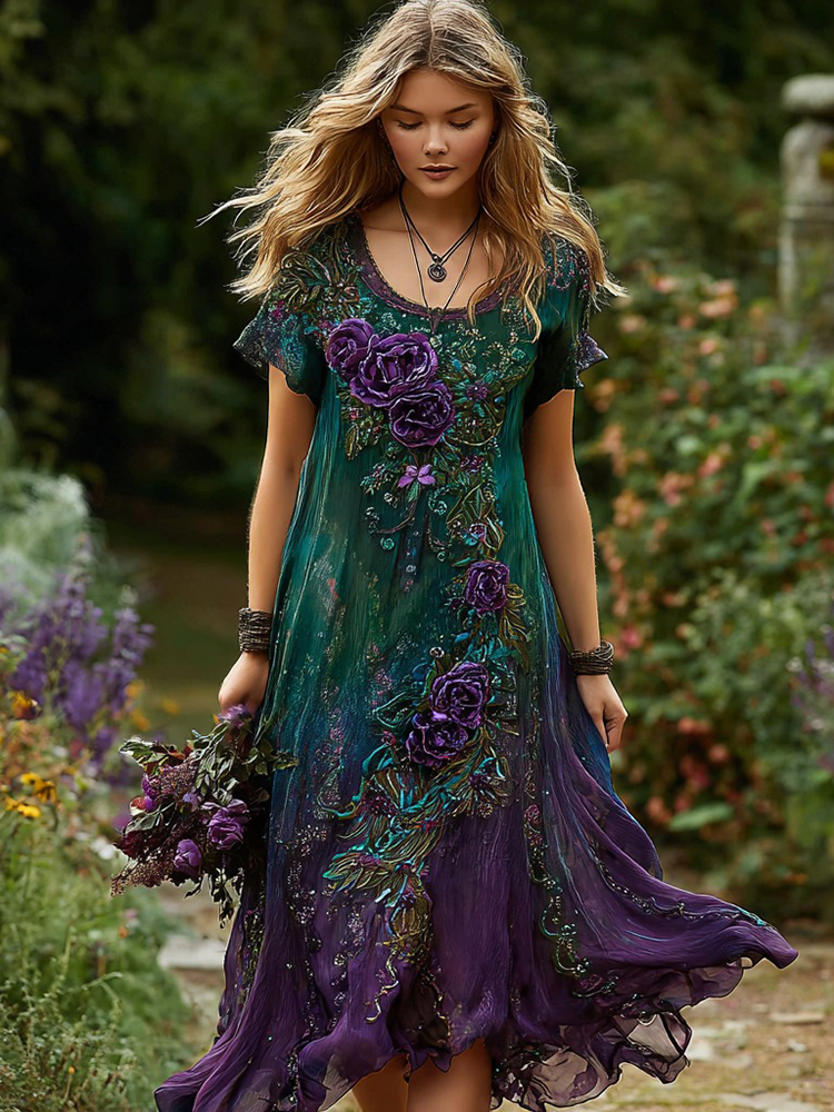 Women's Vintage Rose Floral Short Sleeve Midi Dress